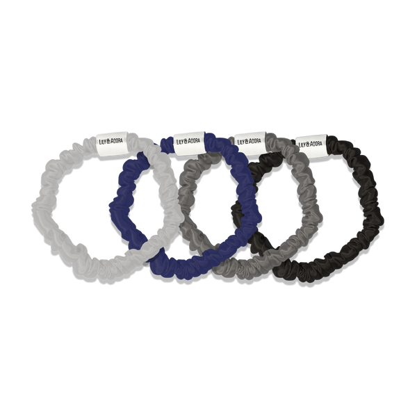 - Midnight Neutrals Set: 1 x Silver, 1 x Navy, 1 x Charcoal and 1 x Black Silk Skinny Scrunchies