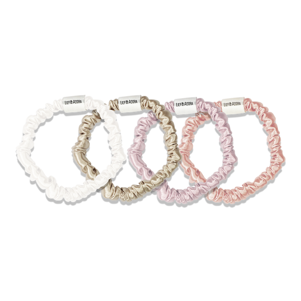 - Soft Neutrals Set: 1 x Ivory, 1 x Nude, 1 x Blush and 1 x Rose Gold Silk Skinny Scrunchies